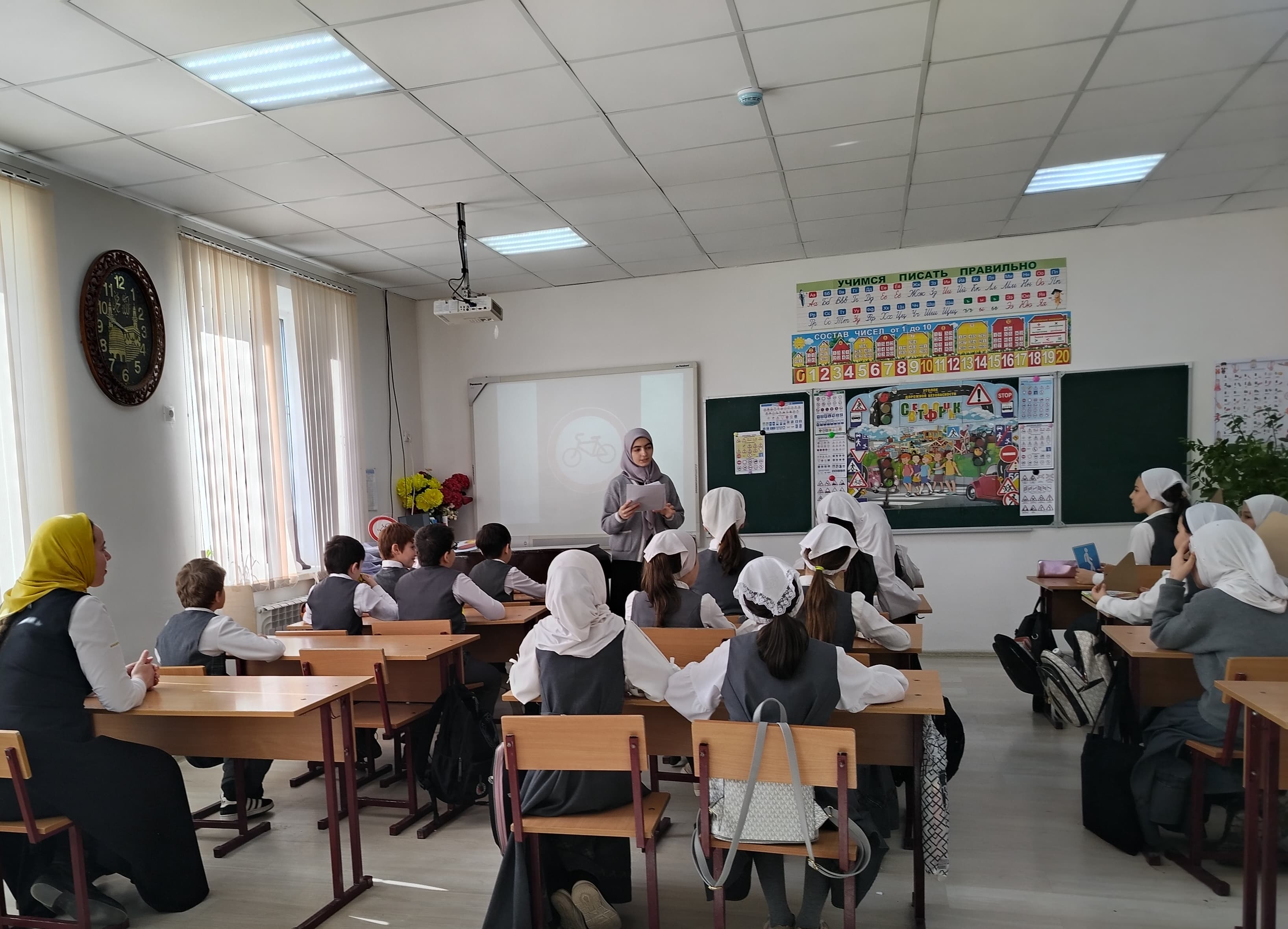 Один из классных часов посетил советник директора по воспитанию и взаимодействию с детскими общественными объединениями Шахбиевой З.О-Х.